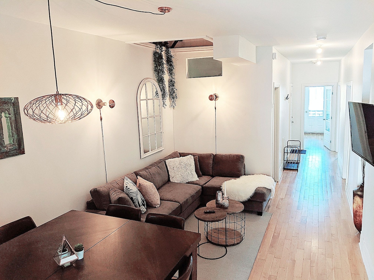 Travel in style and comfort! Very large, stylish, bright 5 bedroom unit. Quality furniture, decoration, skylight, hardwood floors, high ceilings. A beautiful and warm place with a view & patio that can host big groups. Large living room and kitchen with all amenities needed for cooking.